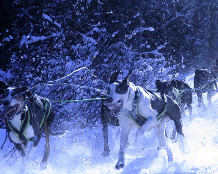 Then we waited. We stood in ankle-deep snow and waited for the soft thump of sled runners over the snow. We waited for the dark movement of dogs ahead and then that sudden motion as a team crested the curve and ran towards us.