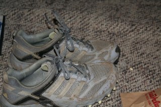 My dirty and beloved Adidas trail runners. LOVE these babies and just bought another pair. They’e actually a mid-level shoe but the best thing to run trails I’ve tried. They’re and flexible, light and thankfully not overally cushioned (what’s up with these cushioned shoes that feel like walking on pillows and totally mess up your gait?). I trust ’em more than the $125 models littering my closet.
