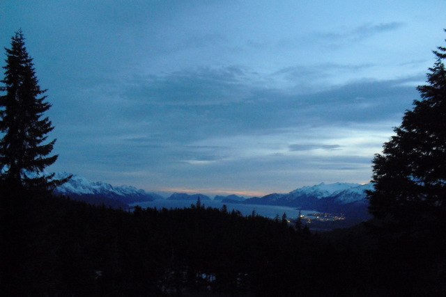 It was dark by the time I hit the last mile, mostly through thick spruce forest, and even with my headlamp the footing was iffy: Snow one minute, ice the next, frozen mud the next. If not for the dog I think I would have become hopelessly lost, but The Beebs was able to pick up the trail, even in rough spots. Cooked her a nice piece of chicken when we got home, which she attacked while I mircrowaved my veggie burgers.