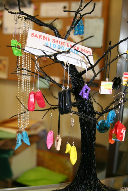 And also HAVE to share what I found in the coolest and quirkest downtown shop (our downtown equals a handful of touristy stores, a couple bars and a cafe or two). Aren’t they the neatest thing in the world? Barbie doll shoe earrings! Real Barbie doll shoes too. I swear. I LOVE the idea, especially since the main character in my novel is an artist who does, um, very odd things with Barbie dolls. Here’s the earrings: