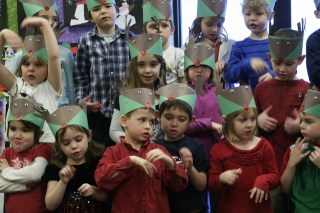 Then I slipped over to the kindergarten classroom for rousing Christmas songs. These kids were adorable. I love the little girl with her arms crossed in the corner of the picture, as if to say: No way am I singing!