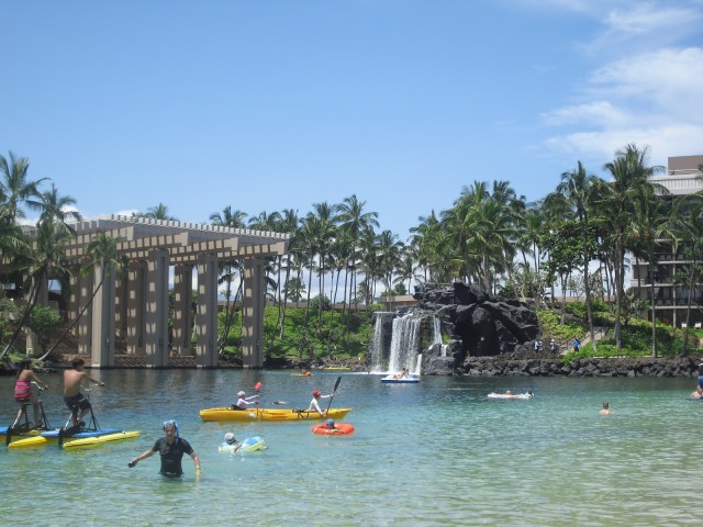 Then we drove down to the coast and stayed at the most wonderfully and outrageously touristy hotel, the Hilton WaikWaikoloa Village. It had everything: Paved walkways, waterfalls, a saltwater lagoon plus swimming pools galore.