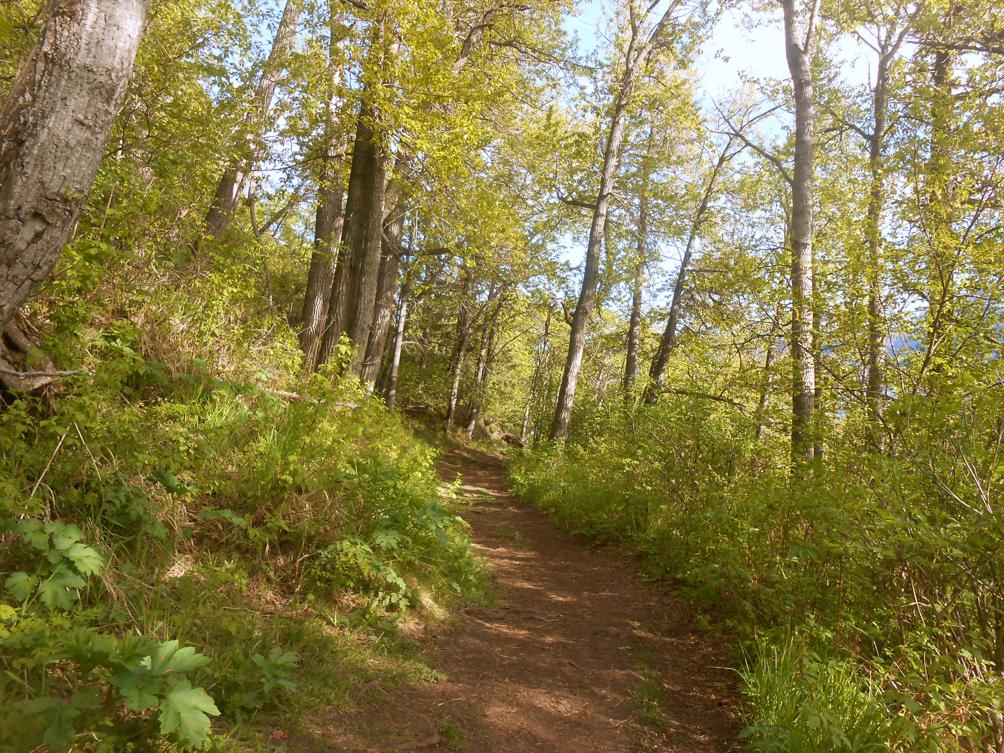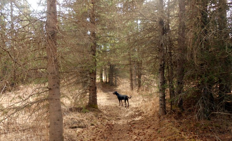 And here’s Seriously, waiting for us to catch up on the top of one of the smaller hills. Seriously loves to run, as long as we keep it to about 5-8 miles. After that, she slumps. It’s not that she’s tired so much as bored. What she loves most is racing off in the trees to sniff out squirrels. After about six miles of that, though, she loses interest and begins to slump. She reminds me of a child in the supermarket: Mom, mom, can we go home now?
